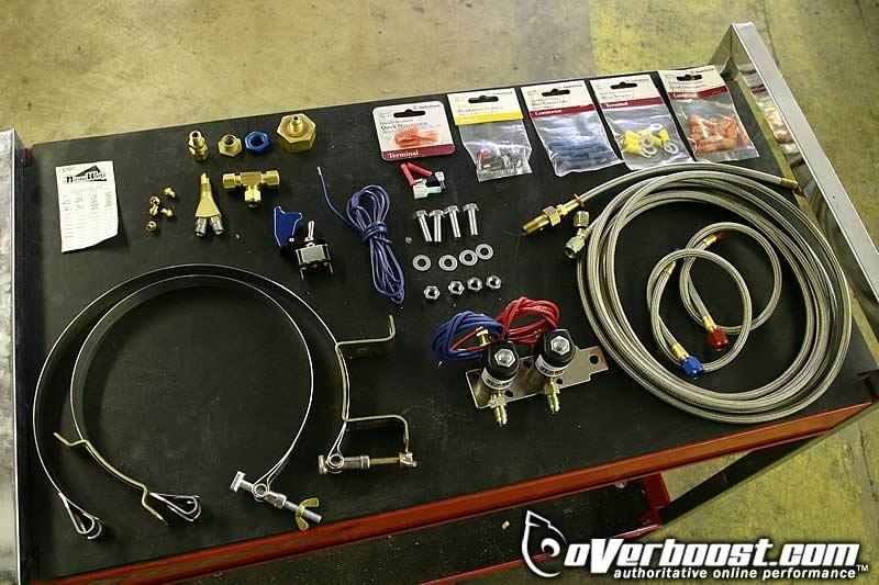 Как Вы видите, комплект от Nitrous Works идёт со всем необходимым: двумя соленоидами, жиклёрами, армированными шлангами, выключателями, 10ти фунтовым балоном, креплением для балона и всем остальным. Для начала мы отключили положительный провод от аккумулятора и разложили все детали, чтобы легче в них ориентироваться.