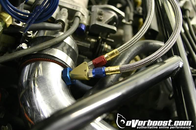 Теперь вкрутите формунку в ранее установленный фитинг, возьмите две армированные линии и правильно прикрутите к форсунке (красная будет топливной линией, синяя - линией для закиси). Далее каждый шланг прикрутите к своему соленоиду. Потом шланг от соленоида закиси - к балону закиси, а коротки Топливный шланг пока пускай болтается неприкрученным.