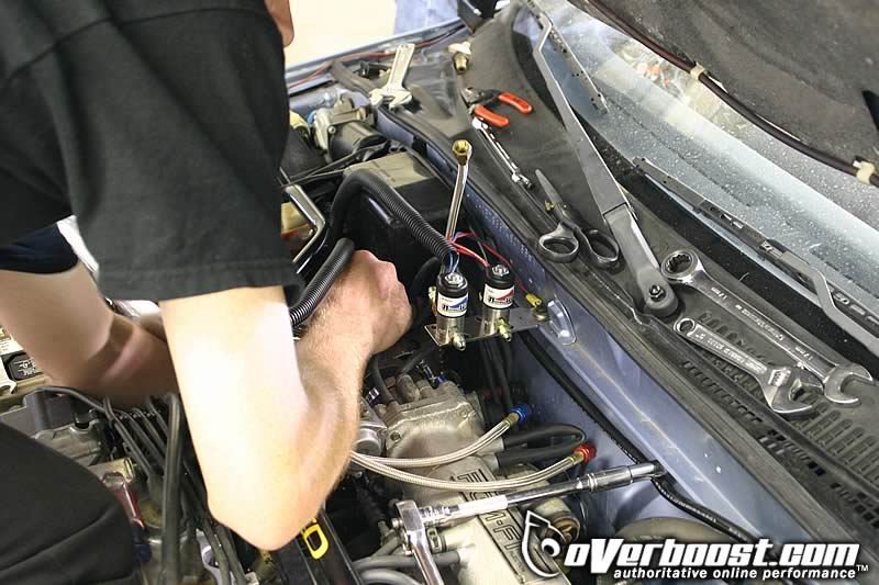 Следующим шагом будет закрепление соленоидов и установка форсунки закиси. Для начала осмотрите моторный отсек, поищите наилучшее место для соленоидов помня, что их нужно держать по-дальше от выхлопных элементов. Мы нашли отличное место на стенке моторного отсека около блока предохранителей. С таким расположением у нас остаётся достаточно места для шлангов подводящих топливо и закись. Как только Вы закрепили соленоиды, переходите к поиску лучше места для установки форсунки закиси. Мы нашли такое место на первом изгибе впуска, просверлили там отверстие и закрепили фитинг с использованием тефлонового герметика. Изучите табличку в инструкции для того, чтобы подобрать необходимые жиклёры и установите их в форсунку.